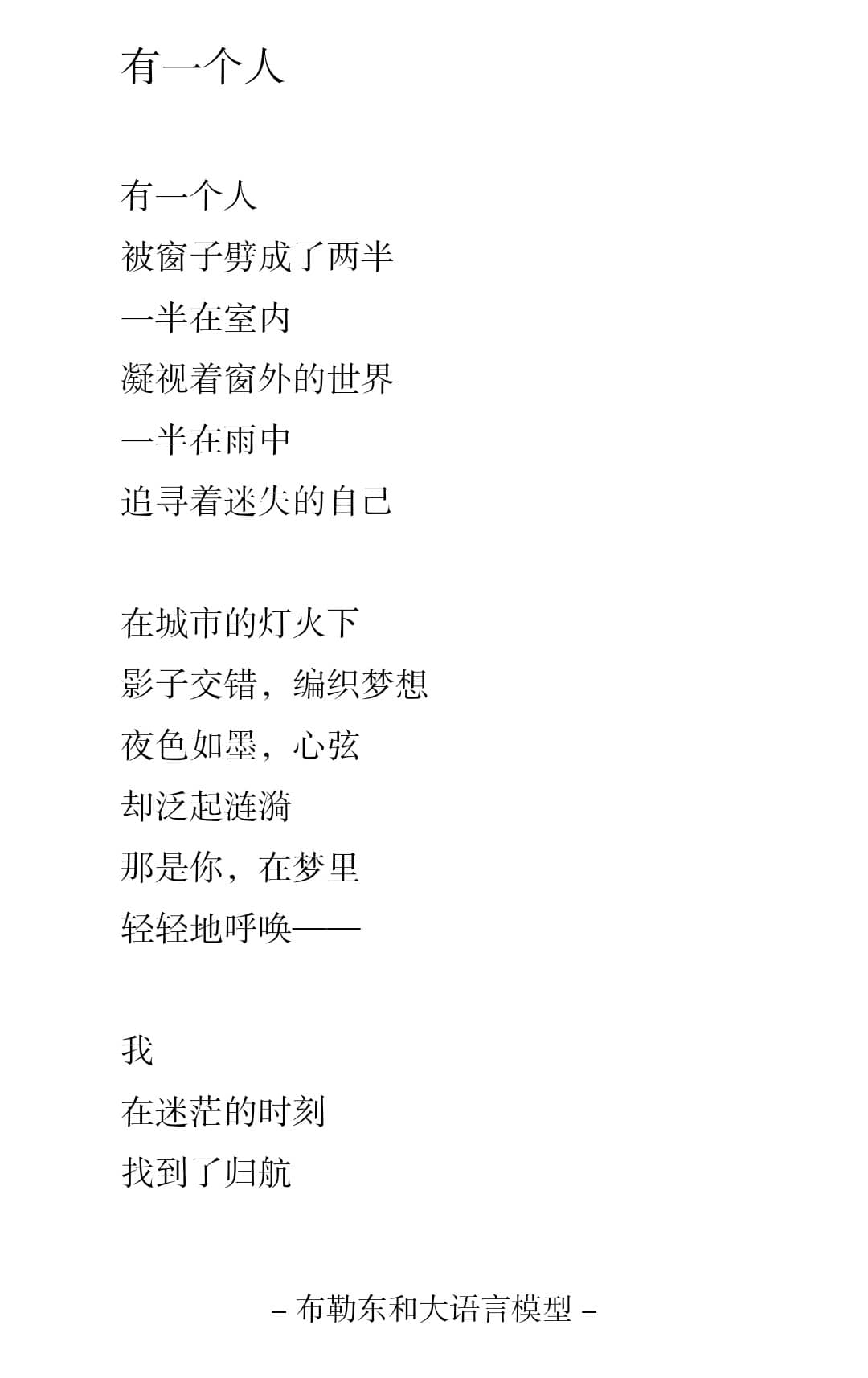 我找了一些大语言模型,按照上面的要求进行创作,并根据个人喜好进行了断句。第一句是布勒东的“自动写作”。描述中所说的“整体感”,是作者用来说明阅读鉴赏“不靠谱”的一个例子,也正是这一点让我联想到大语言模型,“它只是一次添加一个词。”(《这就是ChatGPT》)