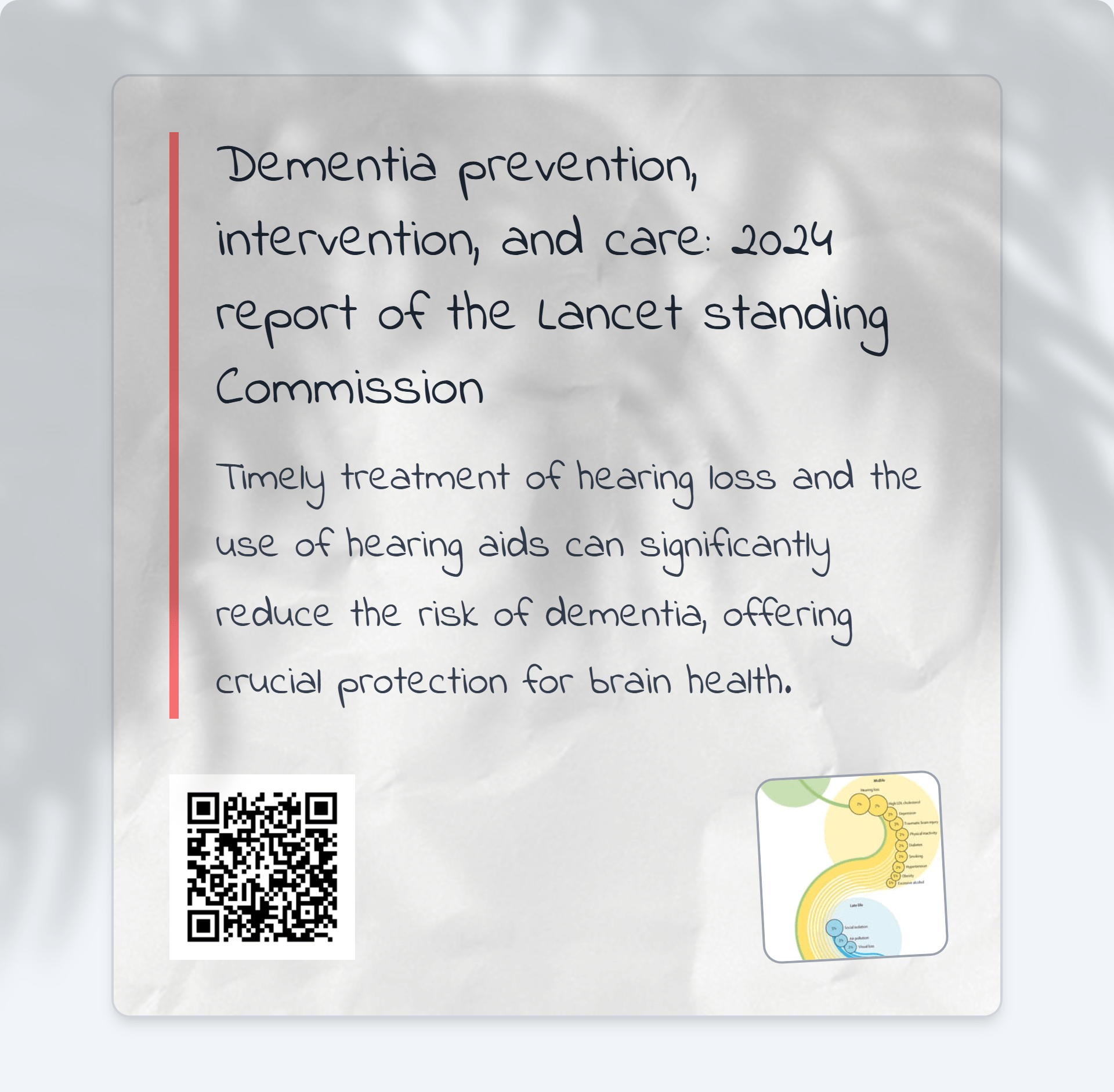 我比较关注这篇文章里提到的听力损失与痴呆症的关系:每 10 分贝的听力下降,痴呆症的风险就会增加 4% 到 24%。不过好消息是,如果及时戴上助听器,这个风险是可以降低的。文章给出了这几种可能的解释:
