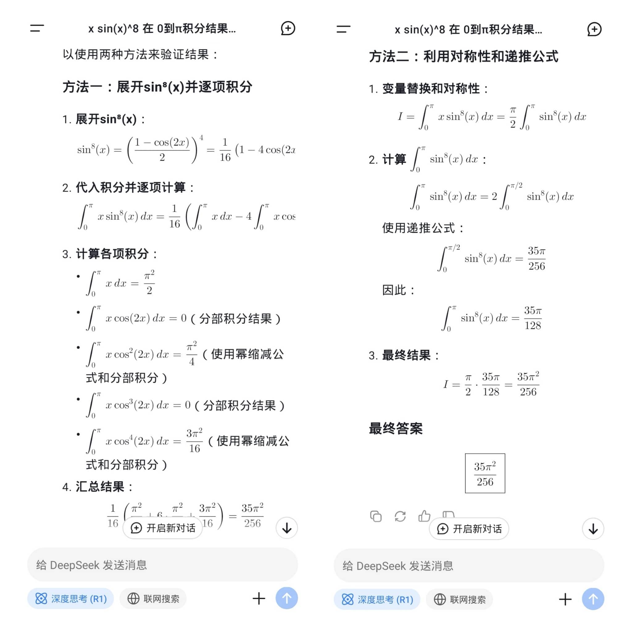 既然 AI 就在手边,完全可以验证一下。DeepSeek-R1 不仅直接给出了正解,还包含两种解答,可以作为交叉验证: