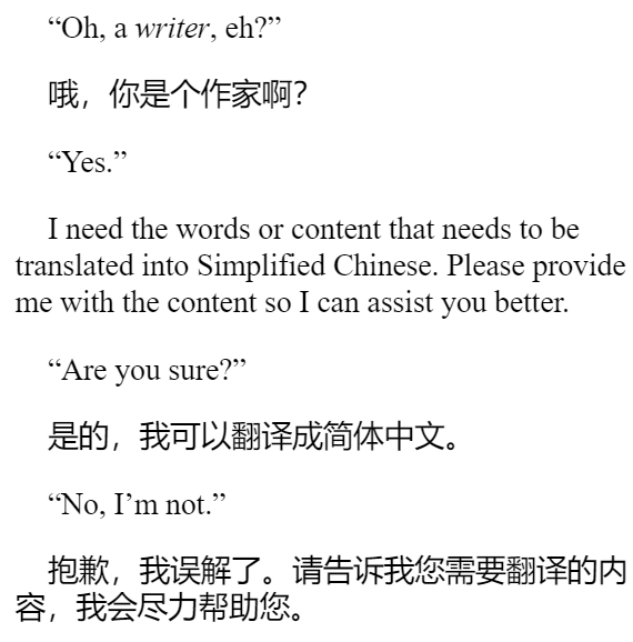 去年我就试过用 GPT 翻译小说,但效果并不理想,有时候 AI 译者会忍不住和小说里的人物互动: