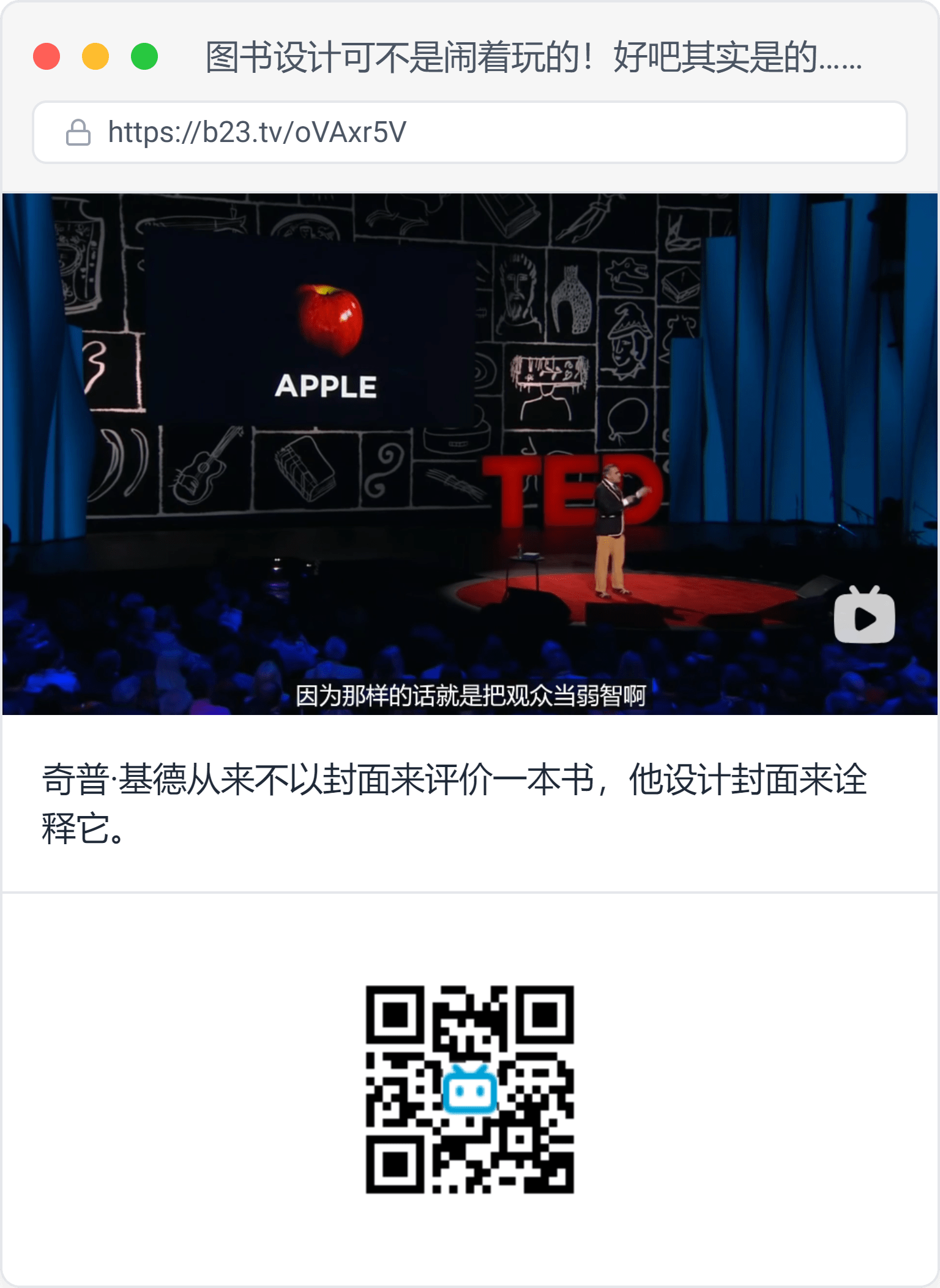 看奇普·基德的TED演讲,说他的老师在第一堂课的一开始,在黑板上画了个苹果,下面写上“Apple”,说,“你要么写这个,要么画这个,二者不能同时出现,要不然就是把观众当弱智。”