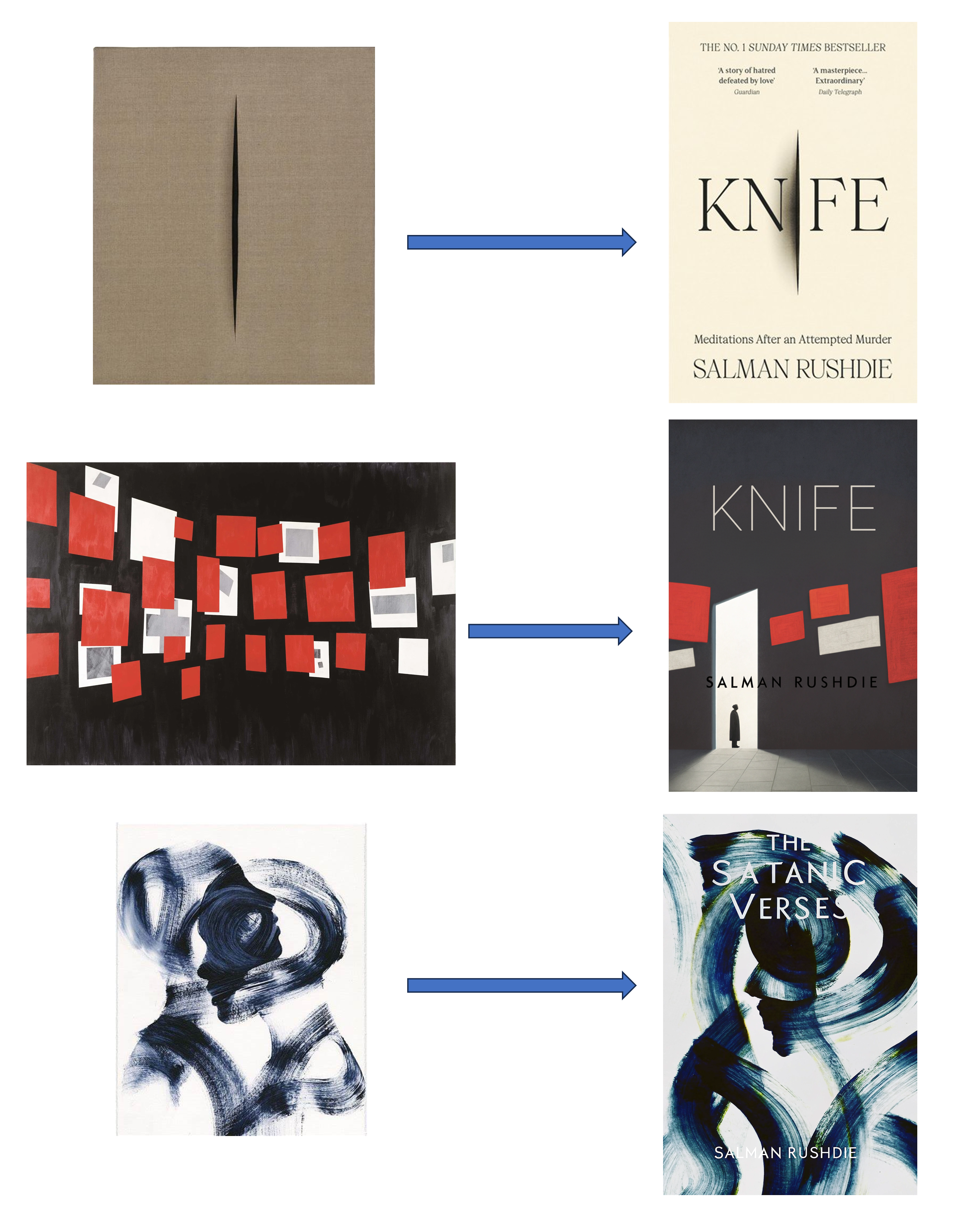 后来读《奇普·基德的设计世界》发现,封面设计很大程度是“拿来主义”的,会做一些摄影和绘画作品的“采样”(不过要发行肯定需要拿到授权)。比如,上面的原版封面就(好像)是封塔纳作品的翻版。于是,我总结了一套“图像再生”流程: