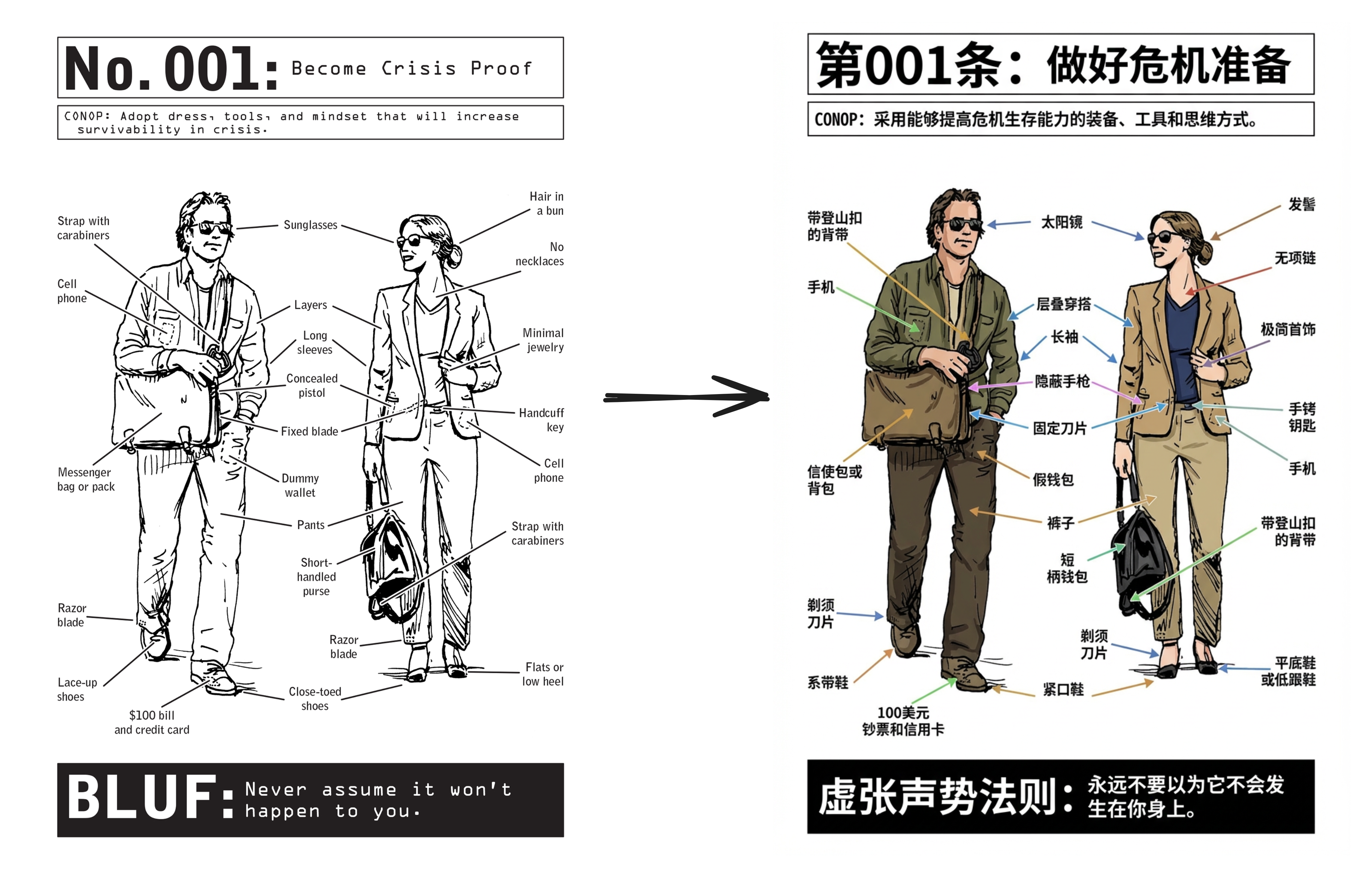 这次除了翻译还上了色,但“虚张声势法则”是胡乱翻译。按照原文来说,“BLUF”是“Bottom Line Up Front”的缩写,大概是“总结”的意思。所以说,图片翻译也是需要术语表的。