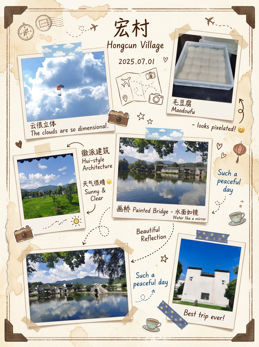 1 | 根据我附上的照片,帮我生成一张拼贴手帐风格的XX旅游笔记(20XX-XX-XX),上面记录着自己的行程以及路上的照片等,文字有中文和英语。 |