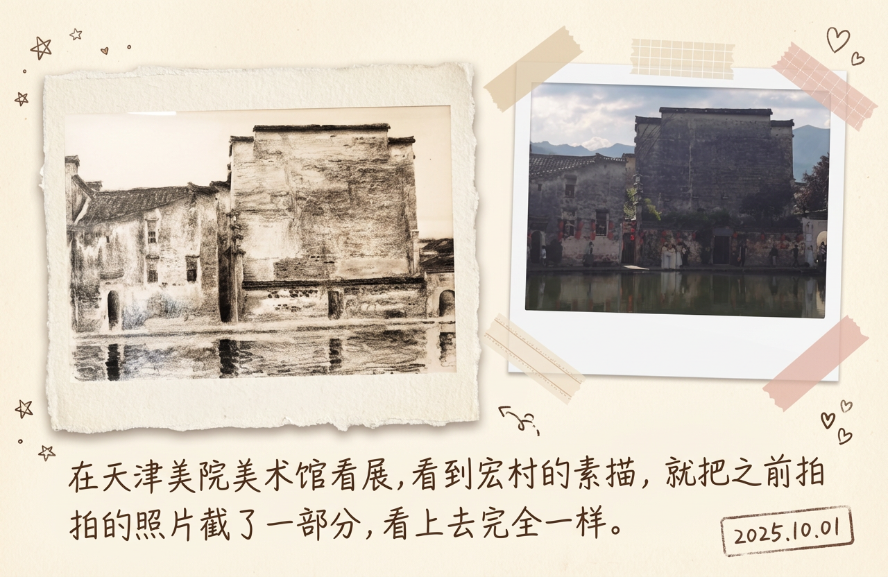 说到宏村,我还想起之前看到的一张素描,很神奇,和我手机里拍下的(经过裁切后的)几乎一模一样。