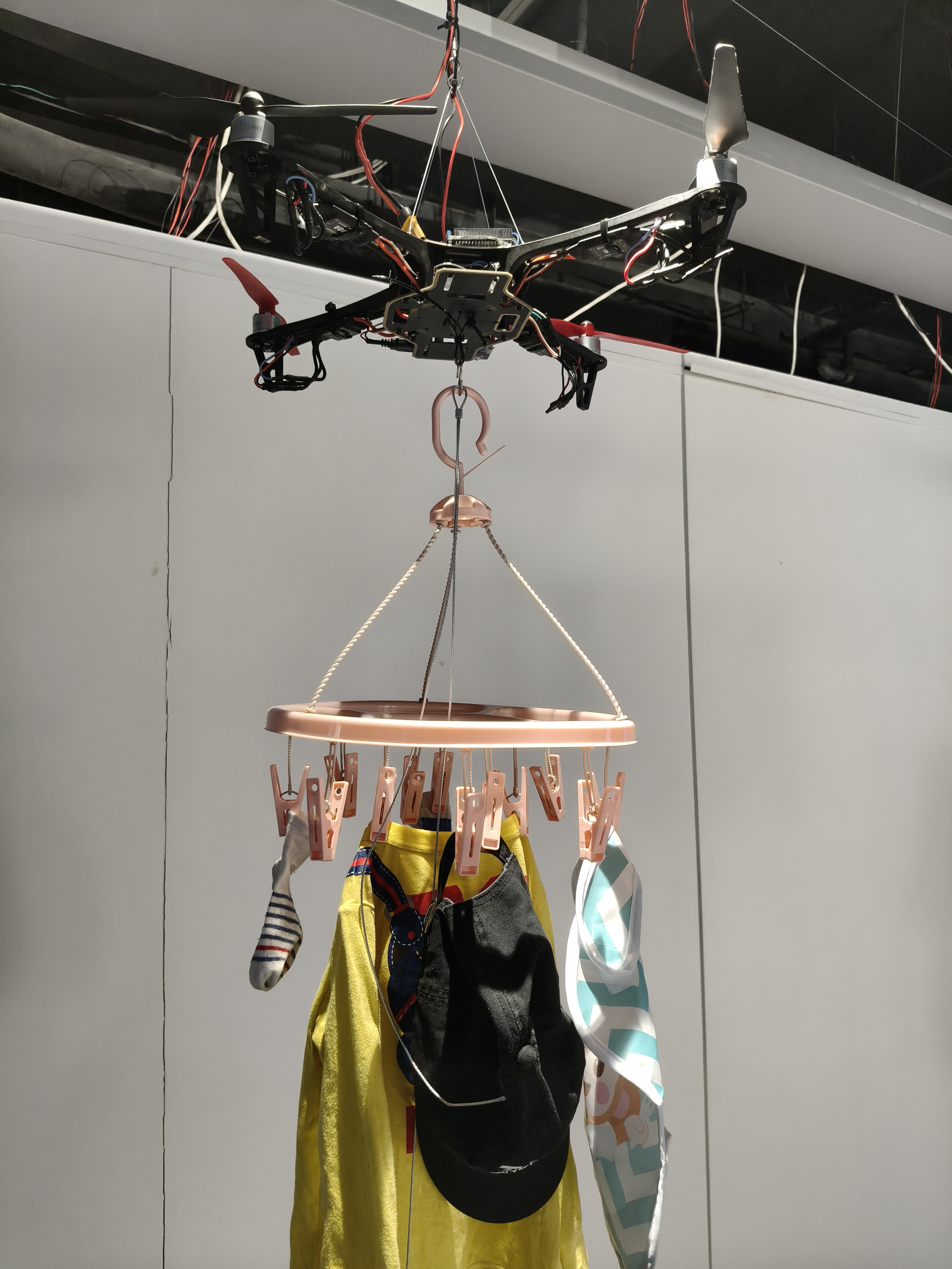 你会看到空中的无人机,不是悬停着,而是悬挂着。下面还吊着圆盘晾衣架,夹子还咬着条纹 T 恤衫、艳丽如街头喷绘的袜子……我猜是新的,但也没有近前。