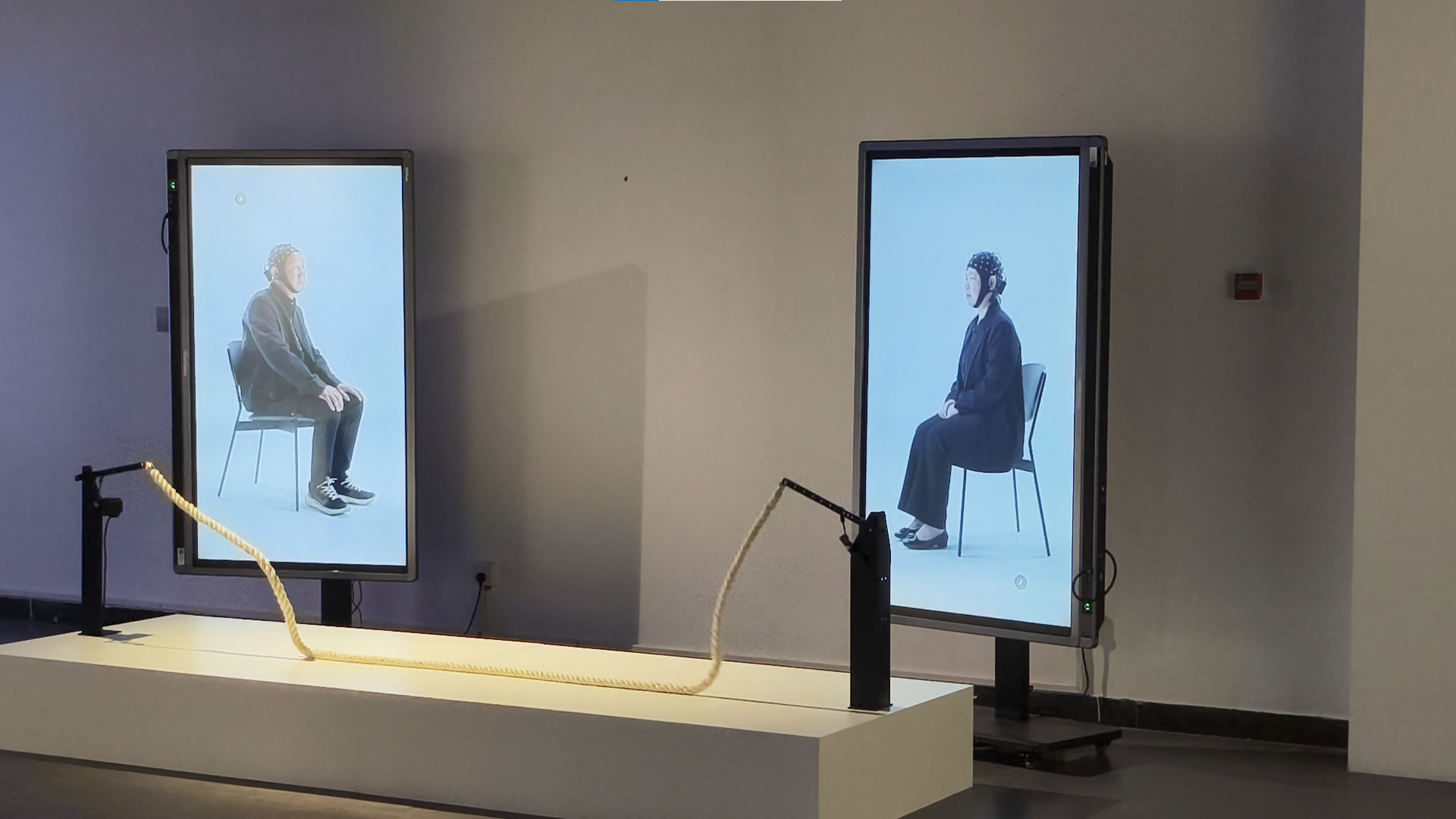 装置由两个摆杆和中间连接的绳子组成,将父母的对视可视化成一对不默契的摇绳人。
