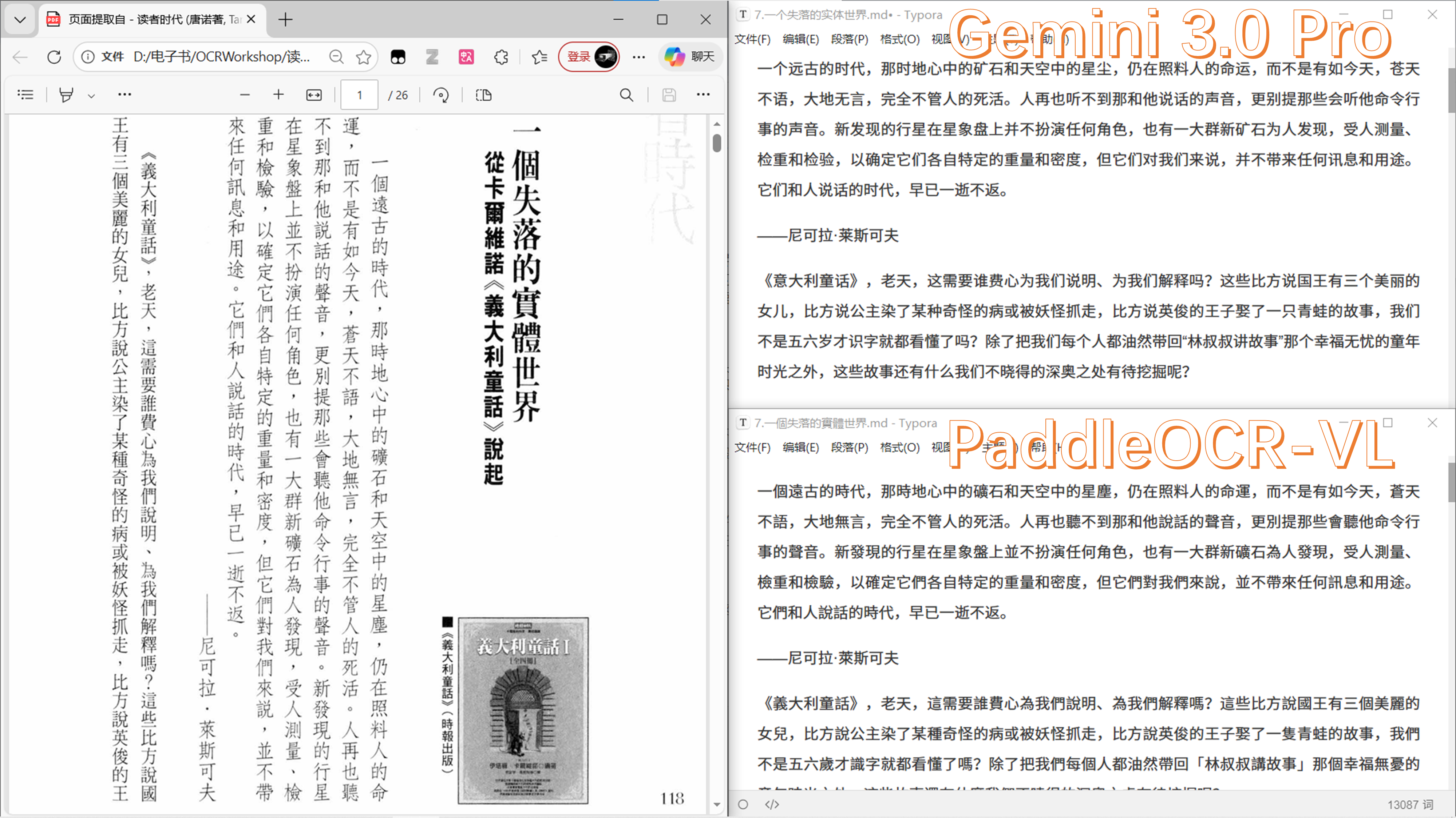 效果如下(PaddleOCR 的结果经过 Gemini 3.0 Flash 校对),都达到了我的可读标准。