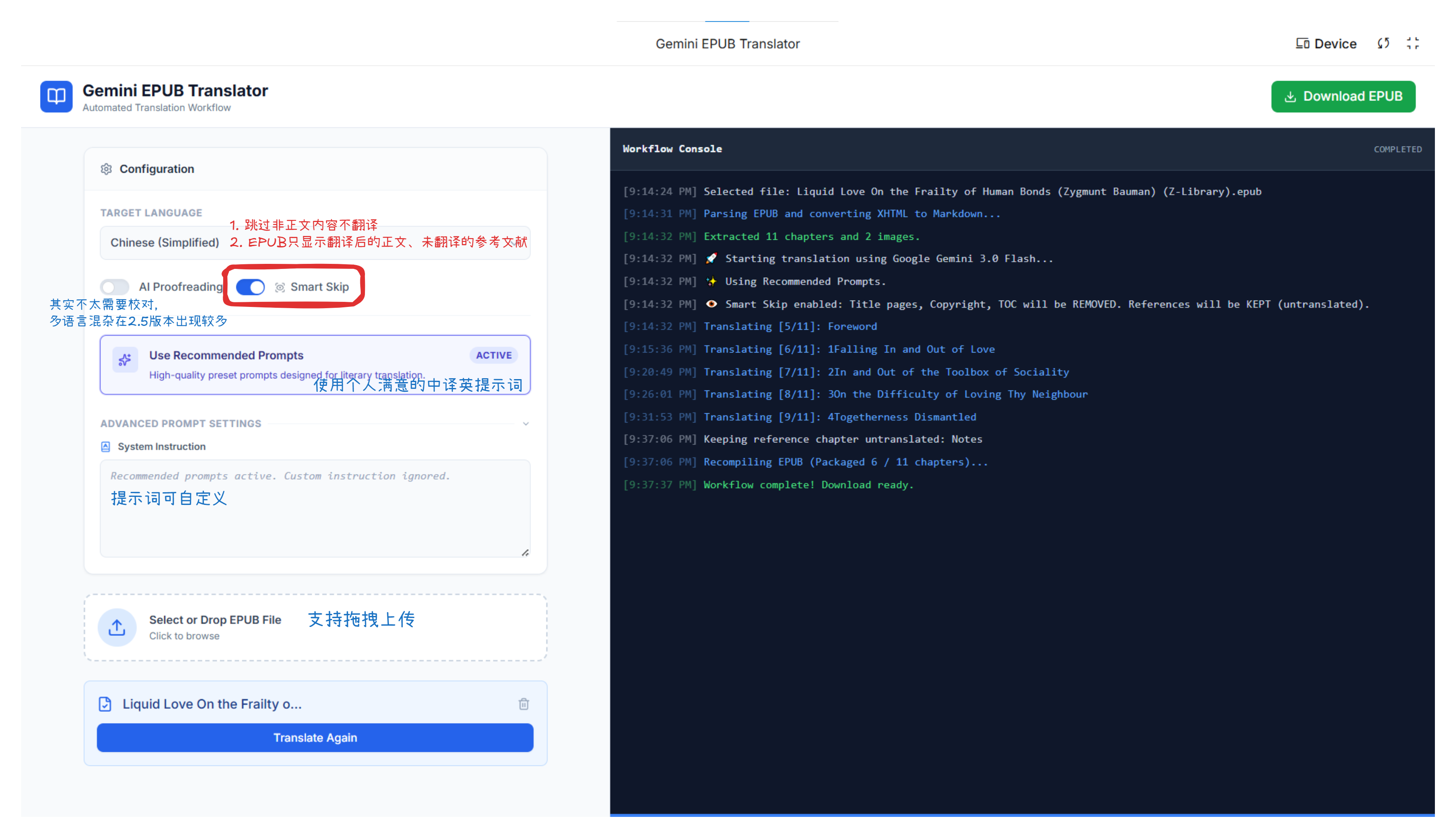 用 Google AI Studio 的 Build 模式写了一版(Gemini EPUB Translator),可以调用 Gemini 3.0 Flash,一键实现上述工作流: