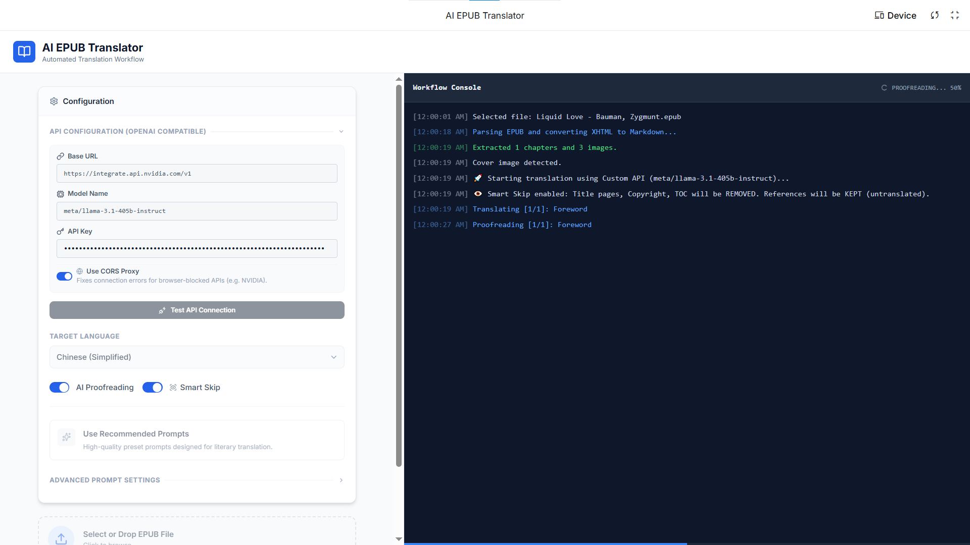后续,我复制了这个项目,改成一个可以自定义调用 API 的版本:AI EPUB Translator,这样就可以下载后用 npm 运行了。