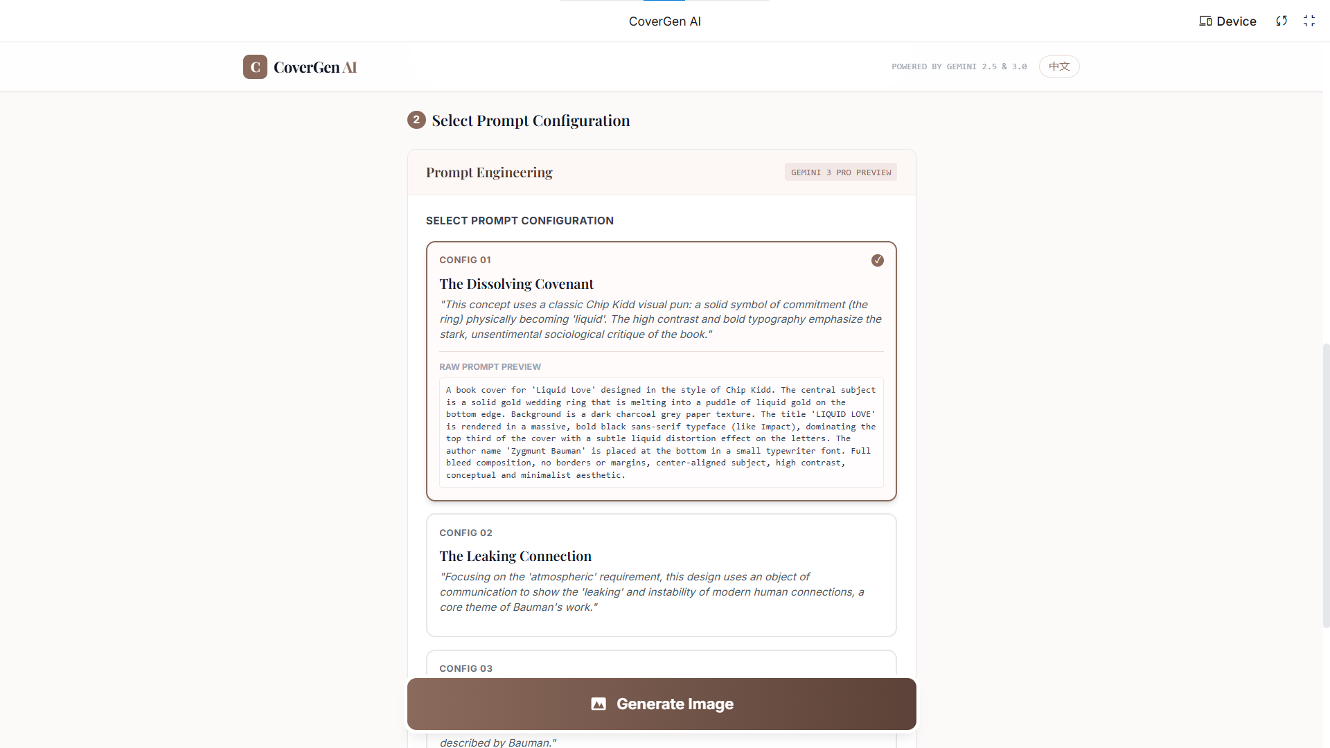 前端解析 JSON 数据,向用户展示这 3 组方案的设计思路(中文)和原始提示词(英文)。用户点击选择其中一组,或在此基础上进行手动修改,确认最终用于生图的指令。图像生成 (Gemini 2.5 Flash)
