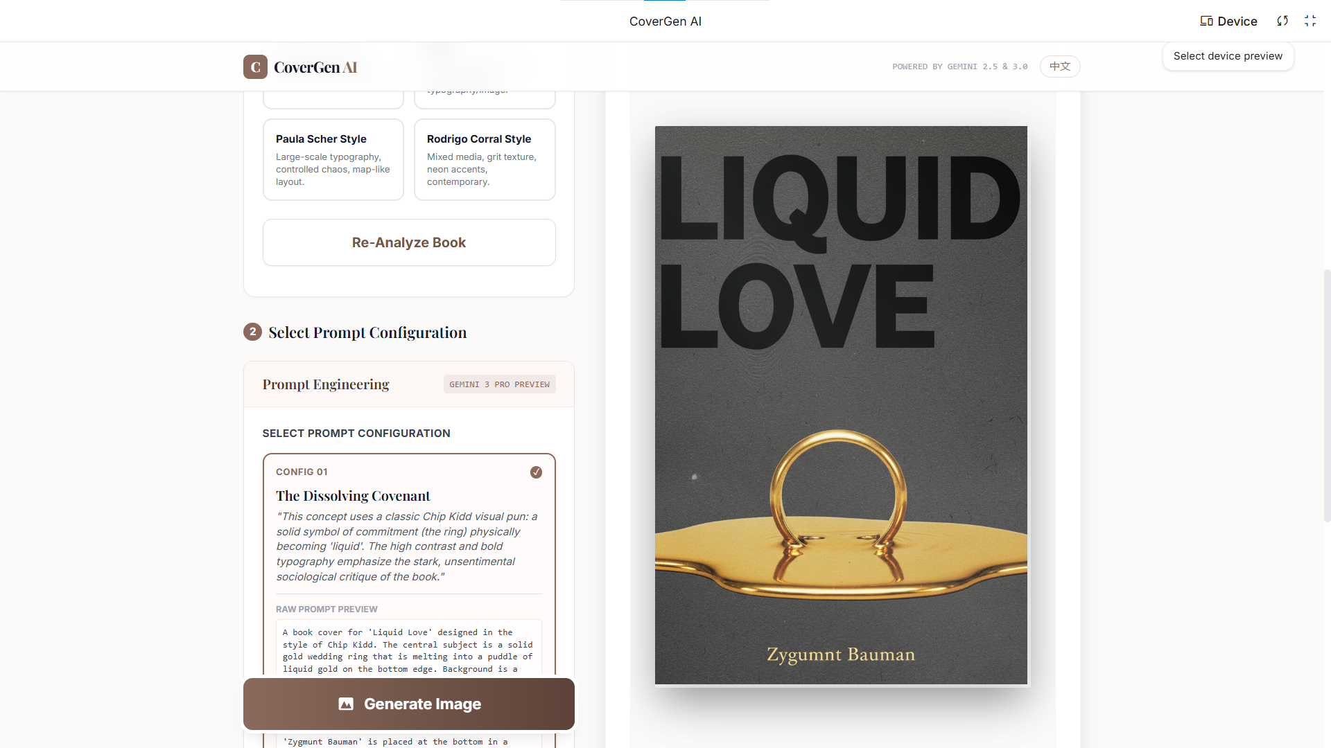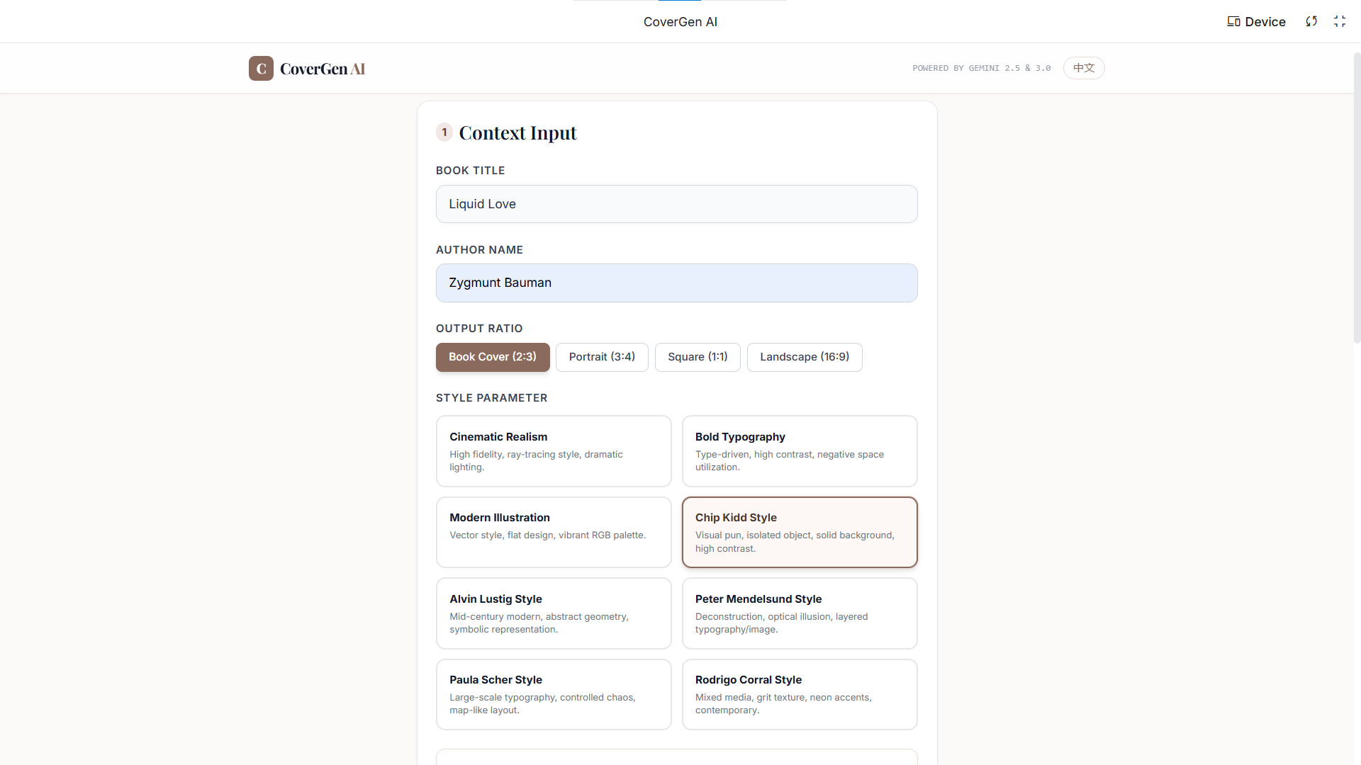 用户在前端输入书名、作者名,并从预设列表中选择一种视觉风格(如“电影感写实”或“极简大字排版”)以及目标宽高比(如 2:3 书封标准)。搜索与推理 (Gemini 3.0 Pro)