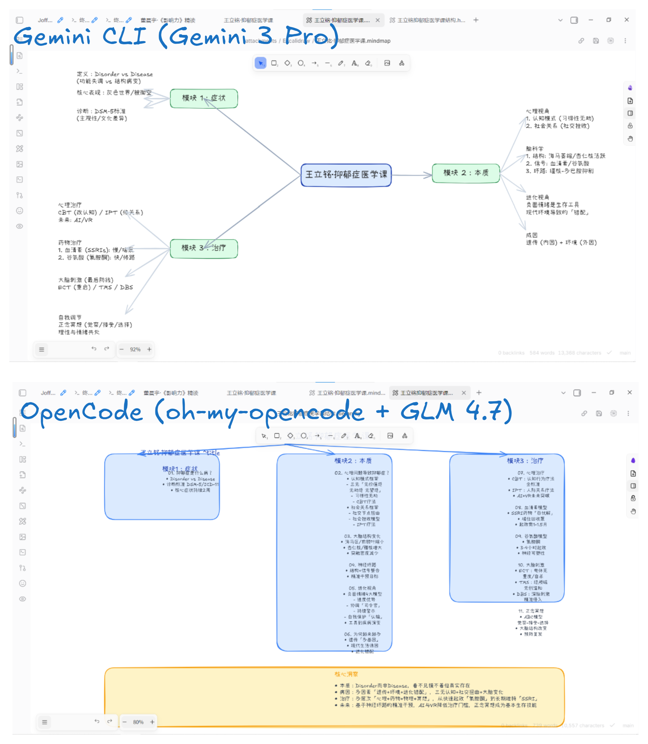 对比一下 Gemini CLI(使用模型为 Gemini 3.0 Pro)和 OpenCode(安装 oh-my-opencode 插件,使用模型为 GLM 4.7)使用同样 Skill 的效果。