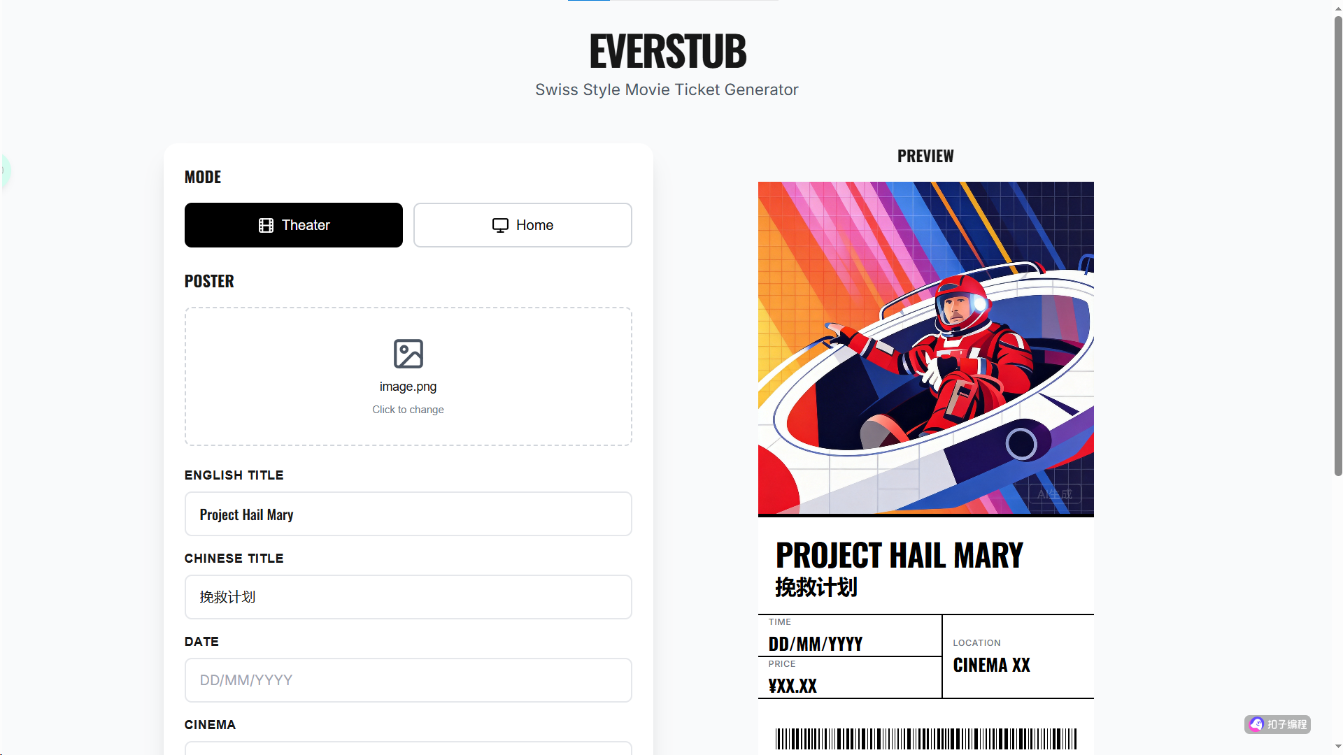 🎫 EverStub 之前用 Google AI Studio 写过生成电影票根的小应用(详见《保管时间:Google AI Studio 自制电影票根》),这次迁移到了”扣子”上。