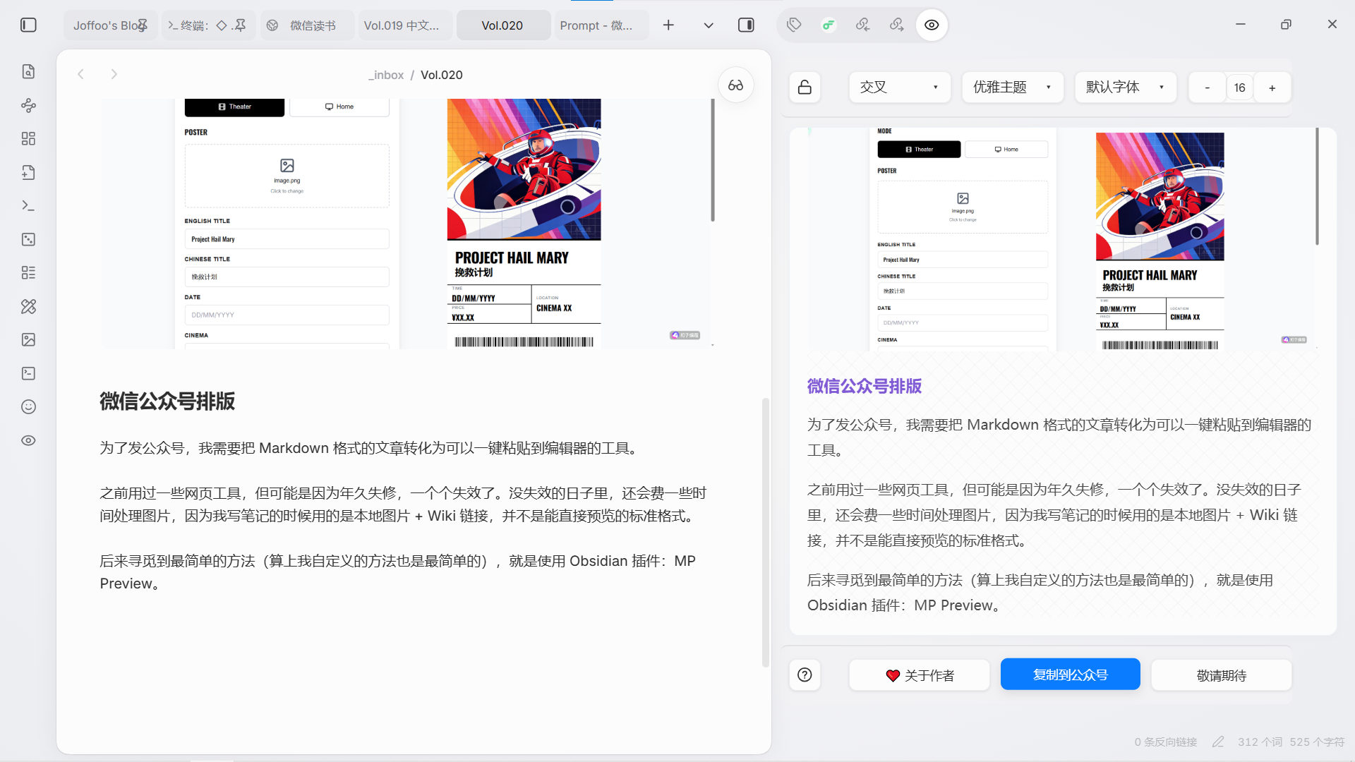 后来寻觅到最简单的方法(算上我后面用的方法也是最简单的),就是使用 Obsidian 插件:MP Preview ,可以实时预览,一键复制。